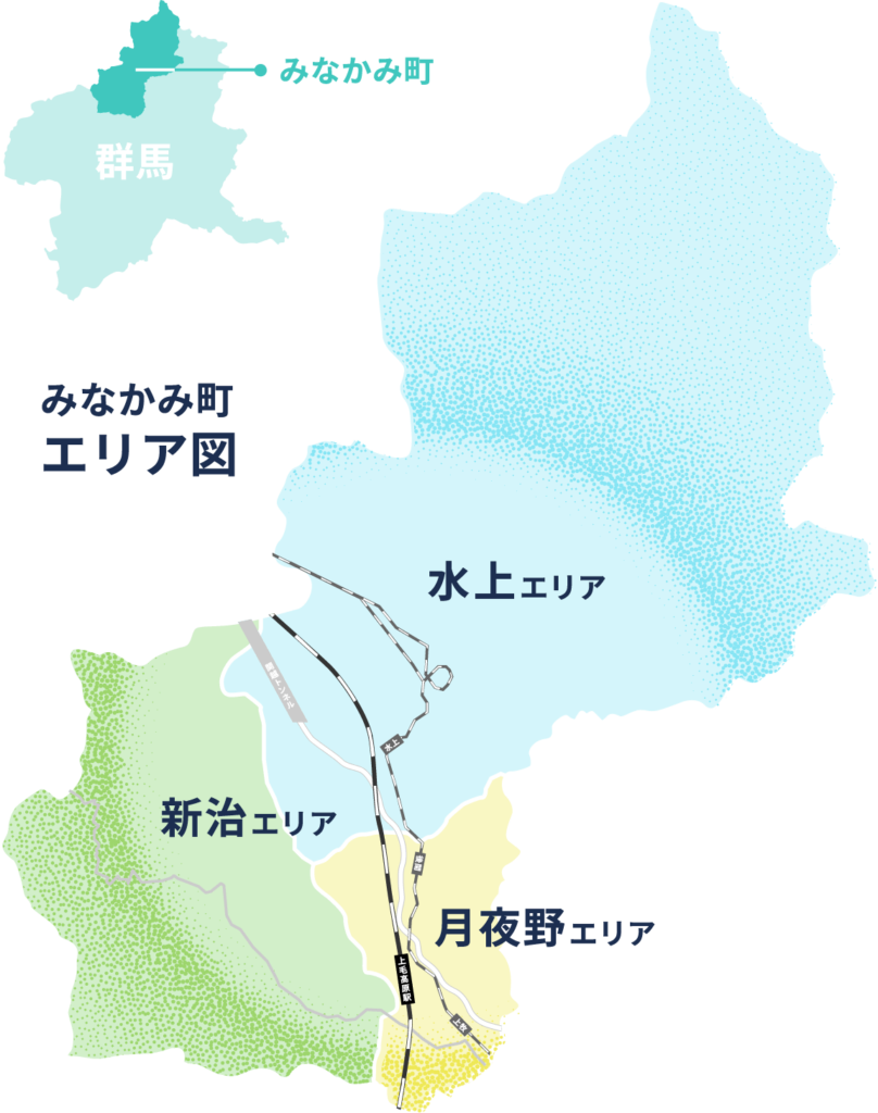 水上エリアは町内北部にあり、登山、キャンプ、温泉などのレジャーがすぐそばの暮らしが叶います。気候や地形の影響で積雪量はエリア内でも差があります。