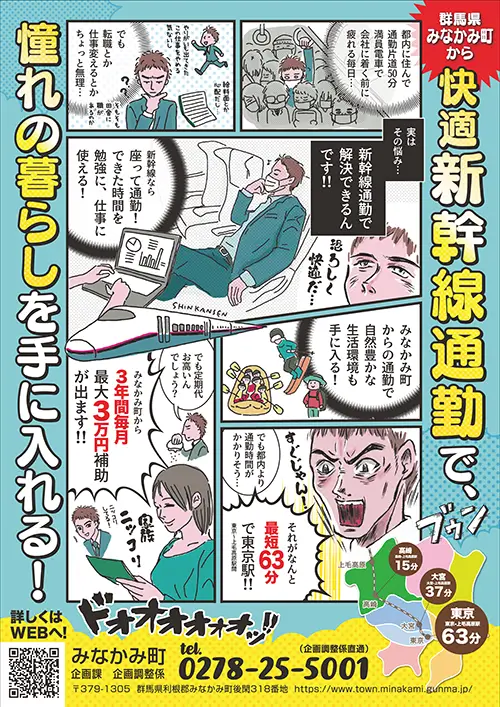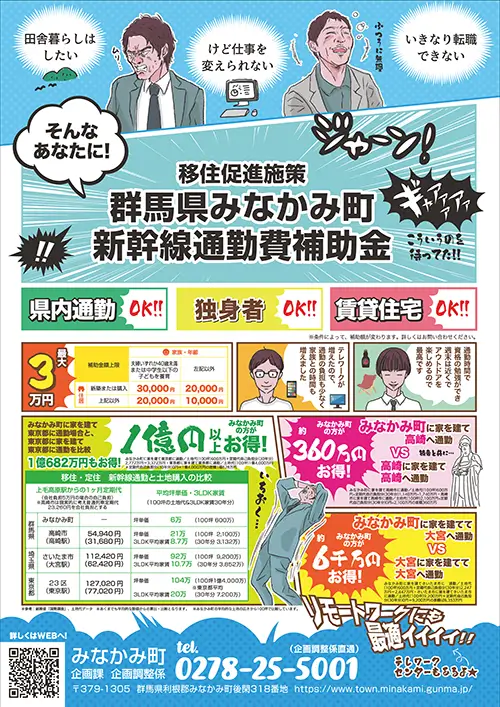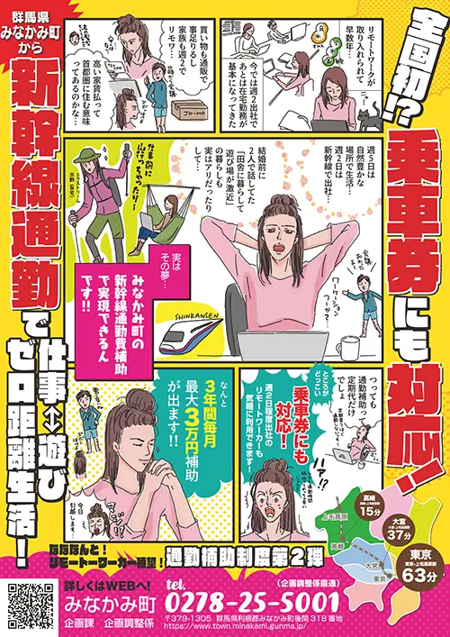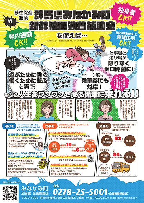 みなかみ町への移住を促進し定住人口の増加を図るため、みなかみ町へ転入し、新幹線を利用して群馬県内外へ通勤する方へみなかみ町新幹線通勤費補助金を交付します。上毛高原駅(みなかみ町)から東京駅まで約66分、大宮駅まで約40分、高崎駅まで約15分と快適通勤が実現できます。そして休日はみなかみ町の自然でリフレッシュ!